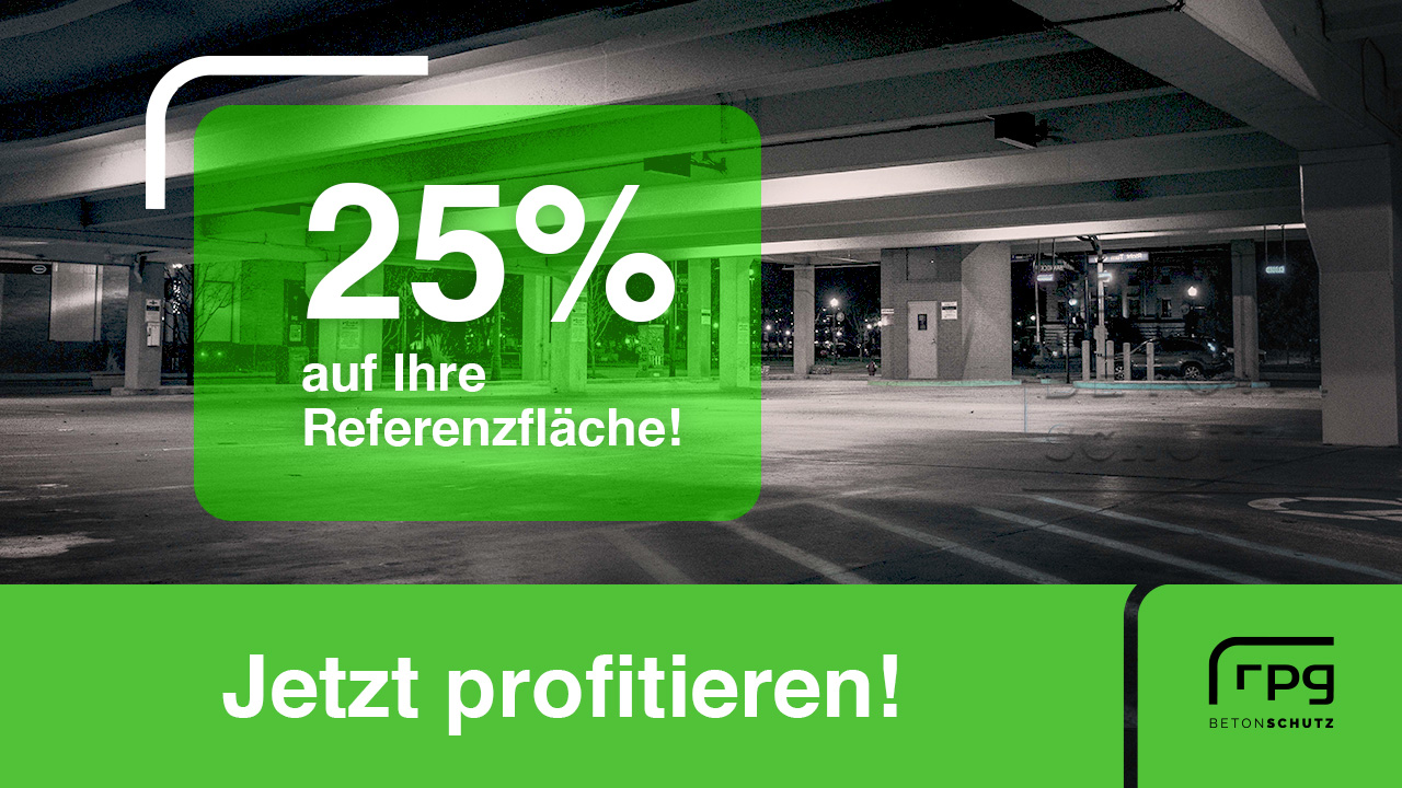 25 % für Ihre Referenzfläche! Sichern Sie sich einen Platz in unserem Leistungsportfolio und dazu einen Rabatt: rpg Betonschutz bietet bis zu 25% Preisnachlass, wenn wir Ihr Projekt als Referenzfläche…